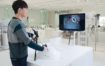 From the 1970s onward, Olympus began full-scale development in the surgical area, aiming to become a comprehensive endoscope manufacturer. In addition to endoscopes for various medical specialties, this area features a range of surgical devices. Visitors can also experience simulated endoscopic surgical procedures.